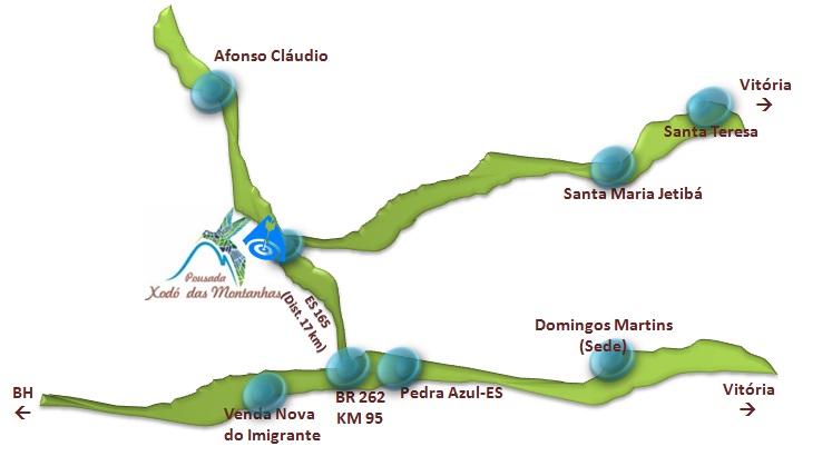 Acesso pela BR262 no KM 95, Segue pela Rod. ES 165 ( Afonso Cláudio) até o KM 128/129 no Trevo Santa Maria Jetiba